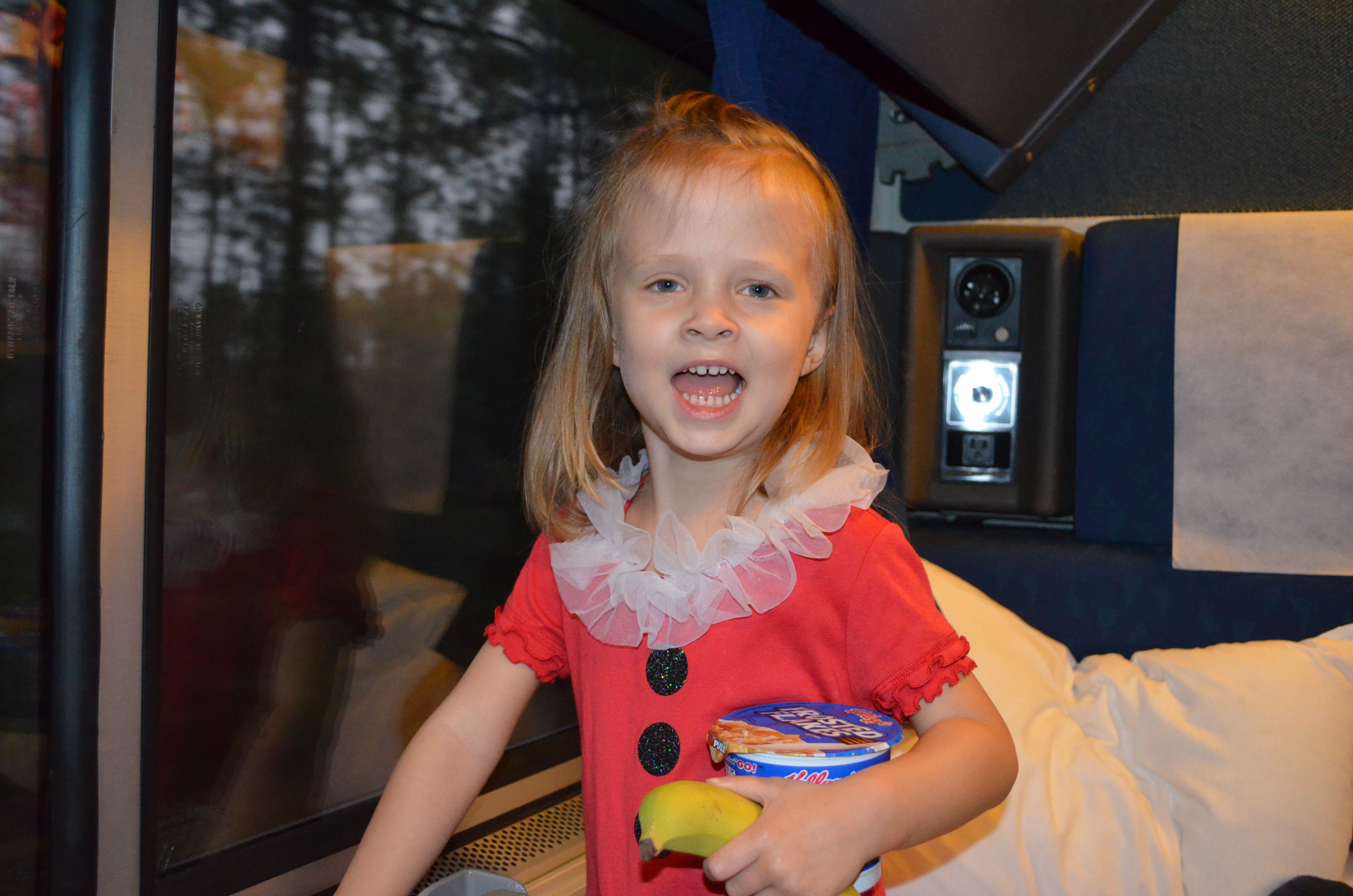 This may not be true for every toddler, but while it was light out, we needed none of the 80 activities we brought on board for Sienna to do. She loved sitting in the big chair, operating the “machinery” (the curtains, the tray table, etc), eating snacks and just sitting pressed up against the glass watching the country go by. After dark, our dinner arrived and Sienna ate an entire steak and most of a piece of cake. We watched one or two TV shows on our Kindle Fire and Sienna was ready for bed.