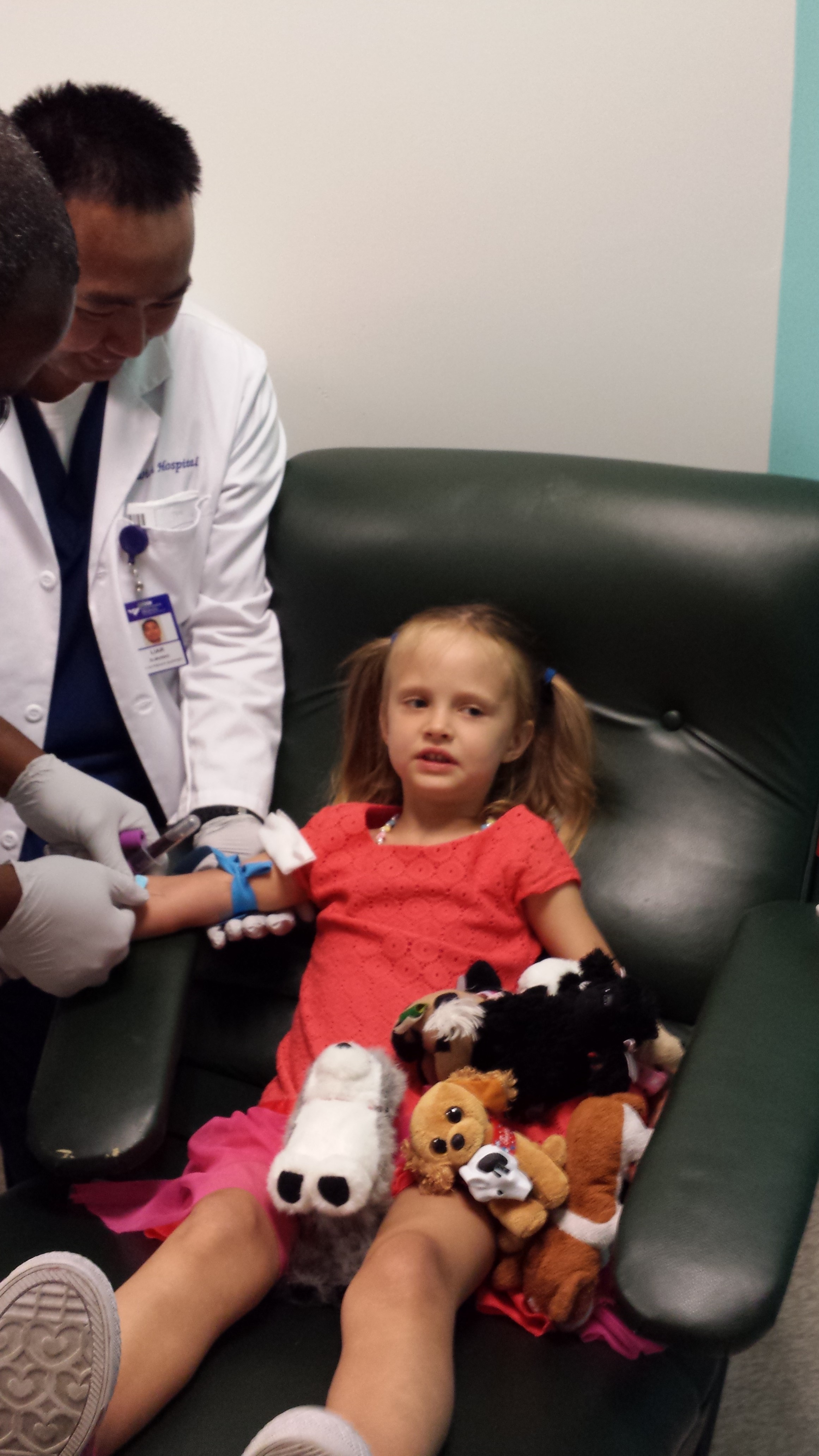 Hmm… Is this is the same office where our beloved new doctor works, the doctor who told us that she will do anything she can to help Sienna? Well here we are, needing a blood draw to help FOP research, which is as helpful to Sienna as one can get!